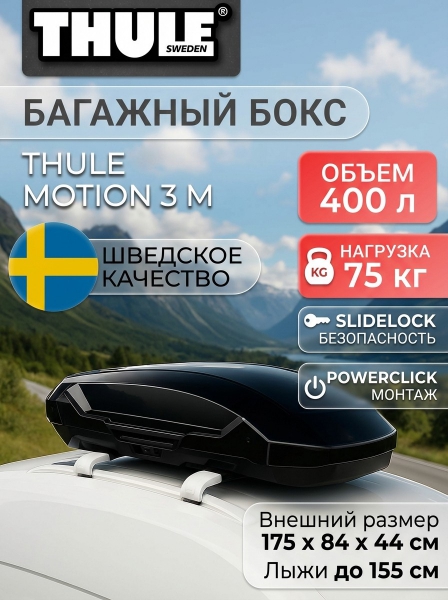 Бокс Thule Motion 3 M - ОписаниеБудь то семейный отпуск, поездка с собакой или лыжное приключение, Thule Motion 3 — идеальное сочетание вместительности, эффективности и стиля. Улучшенная аэродинамика и расширенный размерный ряд, в который вошли новые варианты с низким профилем, позволяет Thule Motion 3 более эффективно использовать топливо без ущерба для объема хранения. Открывать для себя новые горизонты стало гораздо проще благодаря нашим легким в установке и удобным в эксплуатации решениям, а также инновационным аксессуарам.