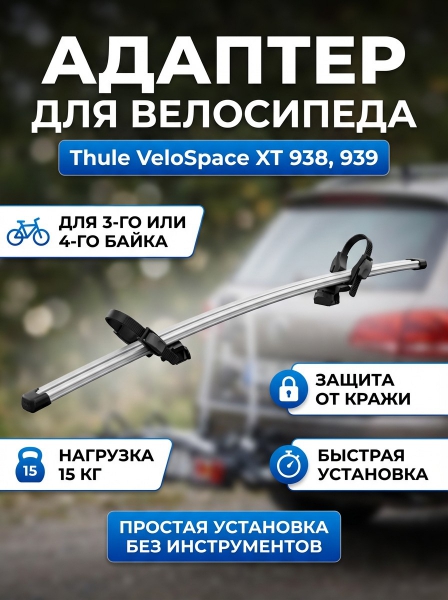 Адаптер для Thule Thule VeloSpace XT Bike 938, 939 - ОписаниеАдаптер Thule VeloSpace XT Bike Adapter предназначен для установки дополнительного велосипеда на крепления для велосипедов на фаркопы Thule VeloSpace XT.