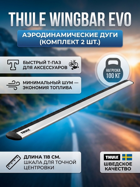 Комплект дуг Thule WingBar Evo 118 см, 2шт. - ОписаниеThule WingBar Evo 118 - новое поколение бесшумных поперечин. Thule WingBar созданы по подобию крыла самолета. Новый стандарт тишины, удобства и безопасности от Thule.