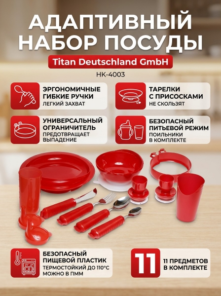 Комплект столовых приборов Titan HK-4003 11 предметов - ОписаниеКомплект столовой посуды 11 предметов (для инвалидов) HK-4003. Комплект включает в себя: стакан, поильник, приспособление для яиц, 2 тарелки, ограничитель для тарелки, столовая ложка, чайная ложка, вилка, нож.