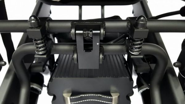 Складной каркас представлен алюминиевым сплавом, покрытый защитным слоем. Сиденье и спинка - мягкие, подлокотники оборудованы не скользящими накладками. Цельная опора для ног откидывается или полностью снимается. Жесткость спинки контролируется натяжением ремней. Наличие амортизаторов смягчает ход коляски. Предусмотрена подушка на сиденье.