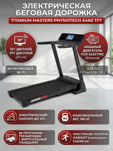Электрическая беговая дорожка Titanium Masters Physiotech A460 TFT - БрендСтрана бренда: Германия Премиальность бренда:Электрическая беговая дорожка Titanium Masters Physiotech A460 TFT - Характеристики