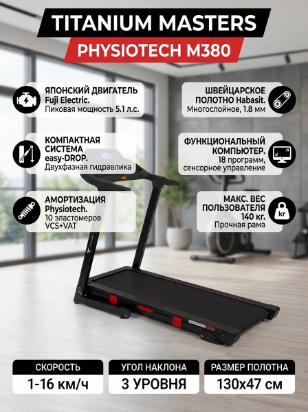 Беговая дорожка Titanium Masters Physiotech M380 - ОписаниеСомневаетесь? - Посмотрите рейтинг ТОП-10 по категории «Домашние беговые дорожки»Titanium Masters Physiotech M380 – электрическая беговая дорожка с передовыми техническими характеристиками по демократичной цене. Рама тренажера построена на передовой платформе Titanium Compact™ с укороченной базой и вынесением моторного отсека под передний вал беговой дорожки. Длина дорожки в рабочем состоянии при размере беговой зоны 130*47 см составляет всего 144 см, а это существенная экономия места при ее использовании.