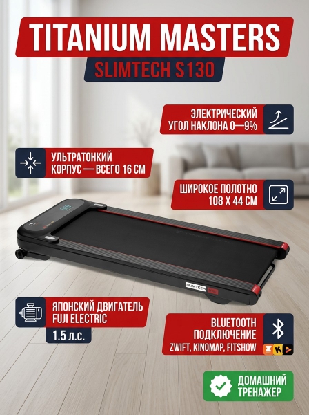 Беговая дорожка Titanium Masters Slimtech S130 - ОписаниеСомневаетесь? - Посмотрите рейтинг ТОП-10 по категории «Домашние беговые дорожки»Беговая дорожка Titanium Masters Slimtech S130 относится к новому классу компактных беговых дорожек с электрическим углом наклона. За счет изменяемого угла наклона можно существенно разнообразить тренировочный процесс и увеличить его общую эффективность – сжигается больше калорий, активнее загружаются мышцы ног и ягодиц, уменьшается время тренировки. Подключение изменяемого угла наклона позволяет увеличить нагрузку в режиме ходьбы, не переходя на бег – обычно это востребовано людьми пожилого возраста, пользователями с проблемными суставами, реабилитационными задачами и всеми другими ситуациями, где бег противопоказан или недоступен из-за физических кондиций.