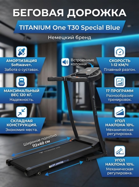 Беговая дорожка TITANIUM One T30 Special Blue - БрендСтрана бренда: Германия Премиальность бренда:Беговая дорожка TITANIUM One T30 Special Blue - Характеристики