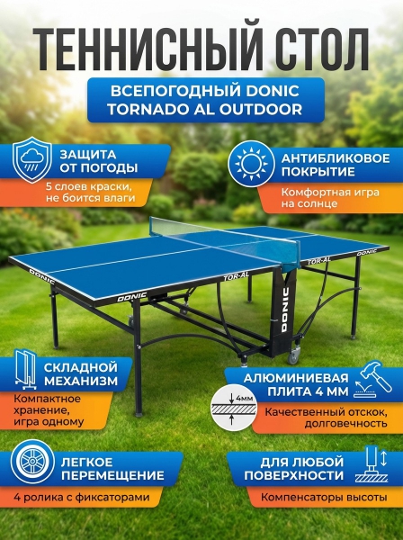 Стол теннисный всепогодный Donic Tornado AL Outdoor - ДоставкаДоставка по Москве: бесплатно, 1-2 дняДоставка по Санкт-Петербургу: бесплатно, 2-3 дня Доставка по России: стоимость уточняйте у оператора. Стол теннисный всепогодный Donic Tornado AL Outdoor - Отзывы4.9