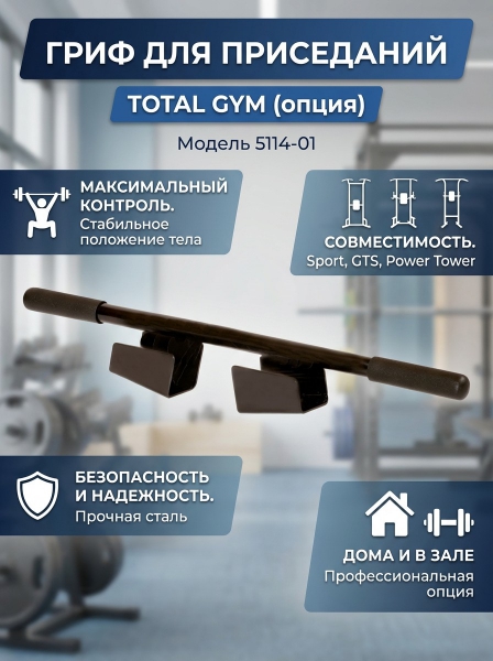 Гриф для приседаний (опция) Total Gym 5114-01 - ОписаниеСомневаетесь? - Посмотрите рейтинг ТОП-10 по категории «Силовые тренажеры»Гриф для приседаний обеспечивает повышенную стабильность и контроль.