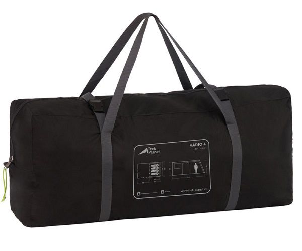 Кемпинговая палатка Trek Planet Vario 4 70297 - ОписаниеКемпинговая четырехместная палатка Trek Planet Vario 4 прекрасный выбор для продолжительного кемпинга с семьей и друзьями. Палатка отличается огромным внутренним пространством, где свободно размещается кемпинговый стол и стулья для большой компании. Передняя стенка палатки перестегивается на вторую секцию дуг, образуя козырек перед палаткой, или может быть отстегнута совсем.