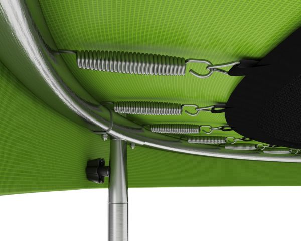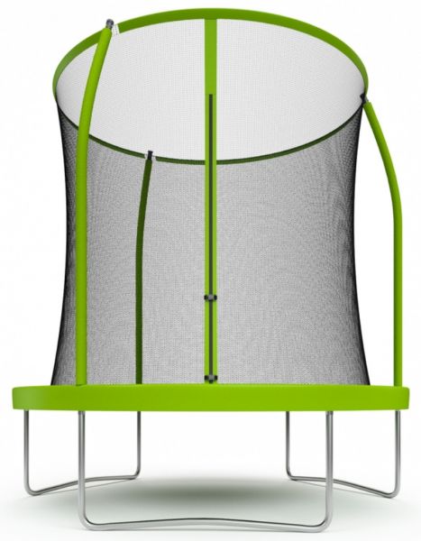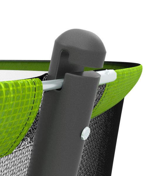 Надежные опорные стойки из оцинкованной стали с двойной порошковой окраской обеспечивают устойчивое положение батута на любом типе покрытия. Максимальную безопасность обеспечивает защитная сетка из высокопрочного нейлона, подушка безопасности толщиной 15 мм и верхние стойки в мягких чехлах из поролона. В качестве материала прыжковой поверхности используется перматрон.
