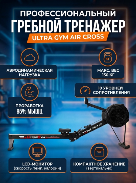 Гребной профессиональный тренажер Ultra Gym Air Cross 002 - ОписаниеГребной тренажёр из профессиональной линейки Air cross UG-CP 002 подходит для спортивных залов и для домашнего использования. Имитация гребли дает эффективную нагрузку на весь организм, развивает мышцы пресса, плечевого пояса, спины, ног, бедер и даёт максимальный расход калорий. Система настройки с различными уровнями нагрузки и одновременный контроль выполнения. Монитор фиксирует результат данной тренировки: расстояние, темп гребли, скорость.