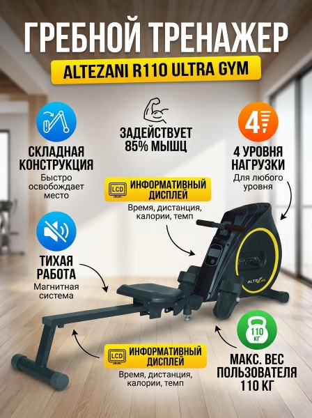 Магнитный гребной тренажер Altezani R110 - ОписаниеСомневаетесь? - Посмотрите рейтинг ТОП-10 по категории «Домашние гребные тренажеры»Гребной тренажер R110 отличная модель для тренировок дома. Тренажер создает эффективную кардионагрузку, позволяет нагружать мышцы спины. Удобные противоскользящие упоры для ног для любого размера стопы, ремни легко и надежно ее фиксируют. 4 уровня сопротивления позволяют подобрать необходимую нагрузку для тренировки, не создает большого шума. Конструкция тренажера устойчивая, гарантирует надежную работу и долгую эксплуатацию. Гребной тренажер подходит для любого возраста и физического состояния тренирующегося.