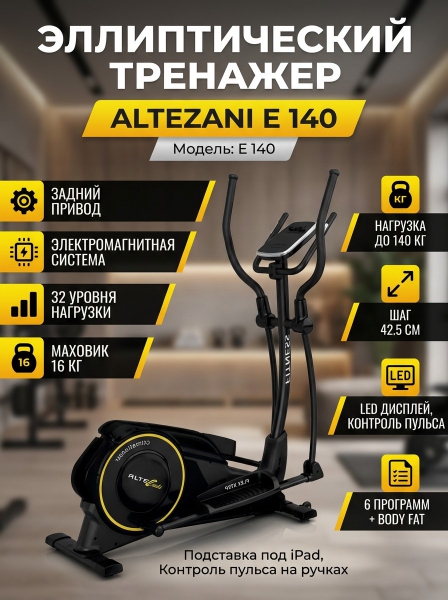 Эллиптический тренажер заднеприводный Altezani E 140 - БрендСтрана бренда: Италия Премиальность бренда:Посмотреть все эллиптические тренажеры для дома Altezani (2) Эллиптический тренажер заднеприводный Altezani E 140 - Характеристики