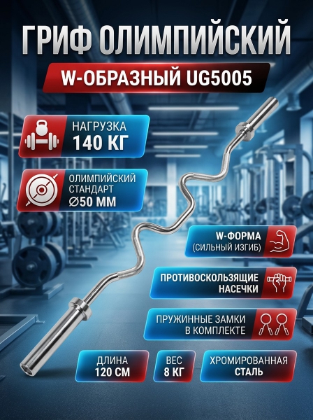 Гриф олимпийский W-образный 120 см Ultra Gym UG5005 - ОписаниеСомневаетесь? - Посмотрите рейтинг ТОП-10 по категории «Грифы для штанги»Гриф олимпийский тренировочный UG5005 W-образный (сильноизогнутый), 1200 мм.