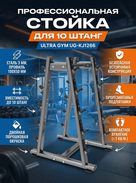 Стойка для штанг Ultra Gym UG-KJ1266 - ОписаниеСтойка для штанг UG-KJ1266 – обязательный атрибут любого тренажерного зала, позволяющий рационально использовать площадь помещения и компактно хранить оборудование. Стойка выполнена из высокопрочных износостойких материалов и предназначена для эффективного использования пространства и хранения до 10 штанг с прямым или изогнутым грифом. Конструктивная особенность оборудования исключает вероятность его опрокидывания, а прорезиненные подпятники делают ее более устойчивой, при этом сохраняя напольное покрытие тренажерного зала.