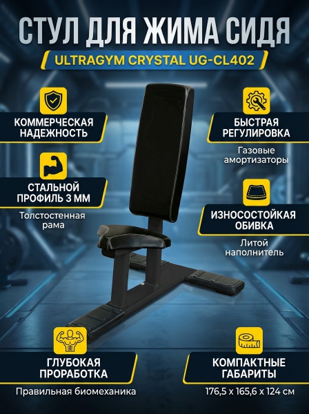 Опция UltraGym Стул для жима сидя - ОписаниеСомневаетесь? - Посмотрите рейтинг ТОП-10 по категории «Силовые тренажеры»Стул для жима сидя UG-CL402 — тренажёр для тренировки верхней части тела. Подходит как для профессиональных спортзалов, так и для домашнего использования.