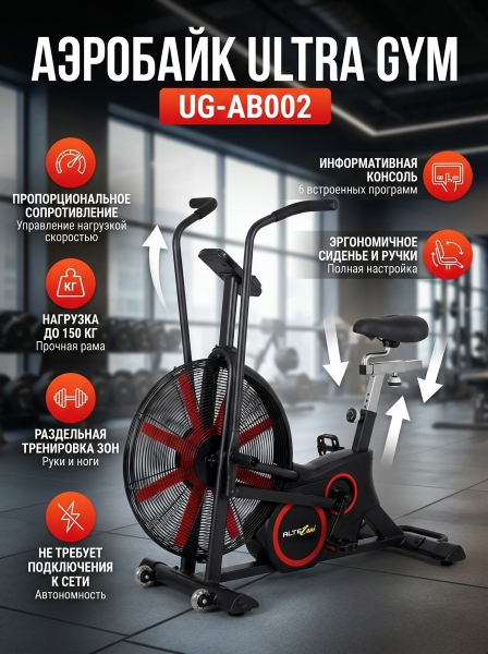 Аэробайк UltraGym UG-AB002 - ОписаниеАэробайк UltraGym UG-AB002 – высокоэффективный кардиотренажер для полукоммерческого использования. За счет аэромагнитной системы нагружения, пользователь получает максимально реалистичную высокоэффективную тренировку, направленную на проработку основных групп мышц рук и ног.