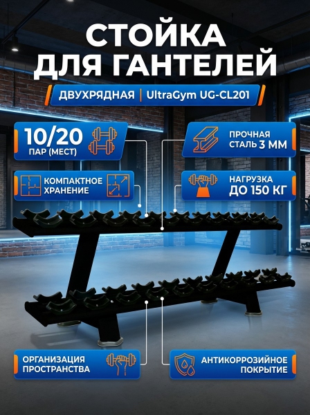 Стойка для гантелей двухрядная UltraGym UG-CL201 (на 10 пар) - ДоставкаДоставка по Москве: бесплатно, 1-2 дняДоставка по Санкт-Петербургу: бесплатно, 2-3 дня Доставка по России: стоимость уточняйте у оператора. Стойка для гантелей двухрядная UltraGym UG-CL201 (на 10 пар) - Отзывы0.0