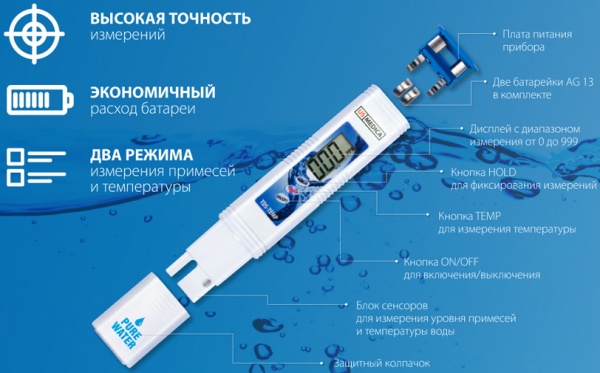 Недостатки: нет Комментарий: показывает точные измерения. Пользоваться этим акватестером легко и просто. Он показывает довольно много измерений. Оказалось, что не такая уж и хорошая вода течет у нас из под крана. |
