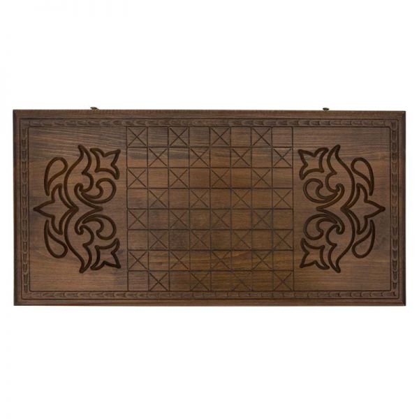 На другой стороне, в центре, находится шашечное поле, а по бокам – цветочный узор. Изнутри также небольшое украшение в средней части, а на каждой ячейке отдельно свой рисунок. Внимание было уделено и петлям с крючками – они не простые прямоугольные, а искусно резные.