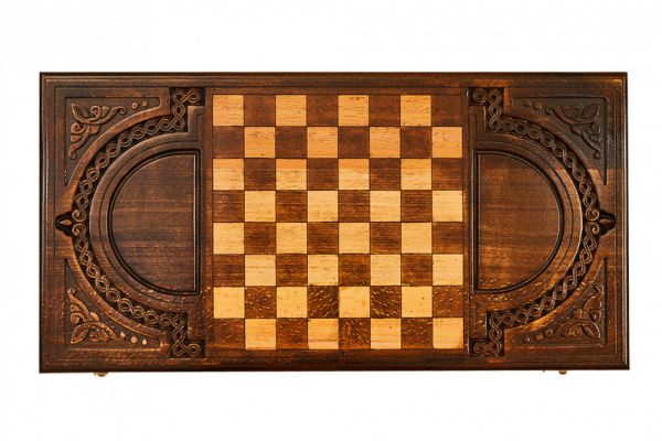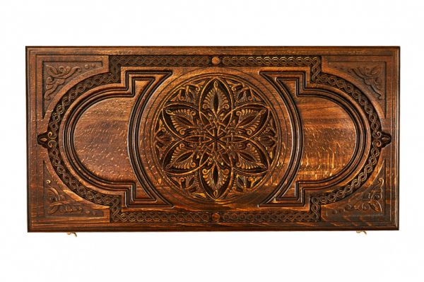 Автор использовал в качестве украшения интересный узор, названный армянским фракталом, который расположился в центре лицевой части. Его окружает аккуратная резьба по дереву, сочетающая различные фактуры, геометрические украшения и многое другое. На задней части предусмотрительно есть поле для игры в шашки. Изнутри нанесён рисунок, который подчёркивает центр и каждый из пазов для фишек. Древесная структура намеренно оставлена и даже подчёркнута, так как придаёт игровой поверхности своеобразной уникальности.