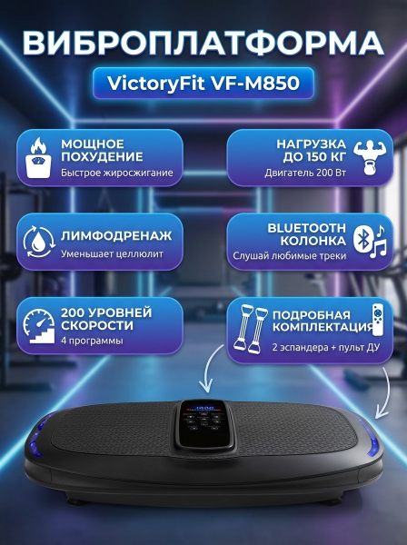 Виброплатформа VictoryFit VF-M850 (черная) - ОписаниеВиброплатформа VF-M850 — это не просто тренажер, это ваш персональный фитнес-центр, который превращает 10 минут в день в мощную тренировку для всего тела!