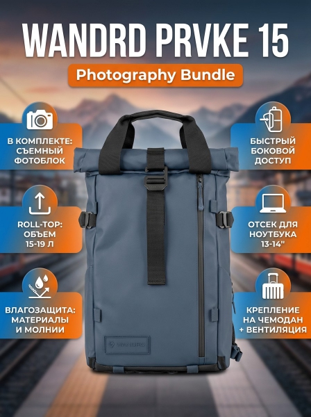 Рюкзак WANDRD PRVKE 15 Photography Bundle, синий, 15 л. - ОписаниеРюкзак WANDRD PRVKE 15 Photography Bundle – это идеальный рюкзак на каждый день. Всем известная и отмеченная наградами серию PRVKE и адаптированная под повседневное использование, вот и получился PRVKE 15 Photography Bundle — компактный и максимально функциональный рюкзак на каждый день. Обновленный дизайн выполнен в современном монохромном стиле: лаконичный внешний вид, ремни и скручивающийся верх выполнены в одном цвете с корпусом — стиль и практичность в идеальном балансе. Для максимального комфорта рюкзак получил новую форму, а также улучшенные плечевые лямки и спинку с дышащими мягкими вставками. Он обеспечивает эргономичную посадку и удобно сидит на любой фигуре. Практичность на высоте: верхний карман с молнией позволяет быстро достать необходимые мелочи, не разворачивая верхний клапан. Внутри вас ждет продуманная организация: отдельный отсек для ноутбука, внутренние карманы для аксессуаров и два внешних кармана для бутылок с водой. WANDRD PRVKE 15 Photography Bundle — это стиль, комфорт и порядок в одном рюкзаке. Создан для тех, кто ценит удобство в каждый момент дня. Рюкзак WANDRD PRVKE 15 Photography Bundle, который вы знаете и любите, стал еще лучше и создан для того, чтобы быть с вами на каждой съемке, в каждом приключении.