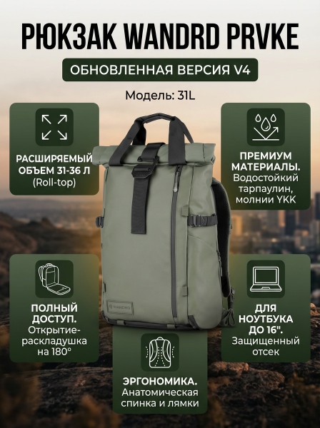 Рюкзак WANDRD PRVKE 31L (V4), зеленый, 31 л. - ОписаниеЛегендарная линейка рюкзаков PRVKE стала еще лучше. В версии WANDRD PRVKE V4 рюкзак получил обновленный минималистичный дизайн: современный монохромный стиль с ремнями и верхним клапаном, выполненными в цвет корпуса. Благодаря новой анатомической форме, переработанным лямкам и спинке с дышащими мягкими вставками, WANDRD PRVKE V4 обеспечивает непревзойденный комфорт и идеально подстраивается под особенности разных телосложений. Снаружи продумана каждая деталь: обновленные ручки, улучшенные бегунки на молниях, сдержанный брендинг, дополнительная молния для быстрого доступа через верх и увеличенное боковое отверстие для оперативного извлечения техники. Внутри рюкзак стал еще более функциональным: переработанная система карманов обеспечивает больше пространства и защиту для техники и аксессуаров. PRVKE V4 — это все, за что вы полюбили WANDRD, но теперь с еще большим вниманием к деталям, удобству и надежности.