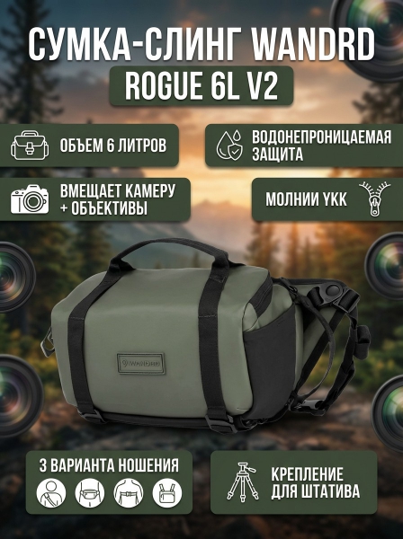 Сумка WANDRD ROGUE Sling 6L V2, зеленый, 6 л. - ОписаниеСумка WANDRD ROGUE Sling 6L V2 обладает функциональностью в обтекаемой, правильной форме - идеально подходит для творческих людей, пассажиров пригородных поездов и всех, кто носит с собой больше вещей, но при этом хочет путешествовать налегке. Благодаря измененной форме, устойчивым к атмосферным воздействиям материалам и внешнему креплению для бутылки с водой, штатива, куртки и т.д., он предназначен для переноски вашего повседневного снаряжения, оставаясь при этом удобным, организованным и готовым ко всему. Сумка WANDRD ROGUE Sling 6L V2 была специально разработана и тщательно протестирована для установки на более широкий спектр камер, включая Canon R5 с разрешением 24-70 мм f/2.8L, Sony A7 IV с разрешением 24-70 мм f/2.8 GM II. Внутри вы найдете настраиваемое хранилище с двумя мягкими перегородками, сетчатыми карманами для мелочей, петлей для ручки, кармашком AirTag и слотами для SD-карт. Снаружи сумка WANDRD ROGUE Sling 6L V2 оснащена устойчивыми к атмосферным воздействиям материалами, двумя ползунками на молнии для основного доступа, отделением для бутылки с водой/штатива в складку, встроенными ремешками для аксессуаров, двумя боковыми сетчатыми карманами и усовершенствованной системой переноски, которая адаптируется к тому, как вы двигаетесь.
