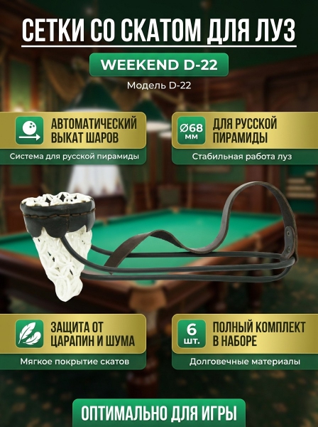 Комплект сеток со скатом для луз с выкатом Weekend D-22 - БрендСтрасть к игре – вот, что объединяет специалистов компании Weekend. Под этой торговой маркой выпускаются игровые столы, аксессуары для бильярда, покера и многое другое.