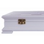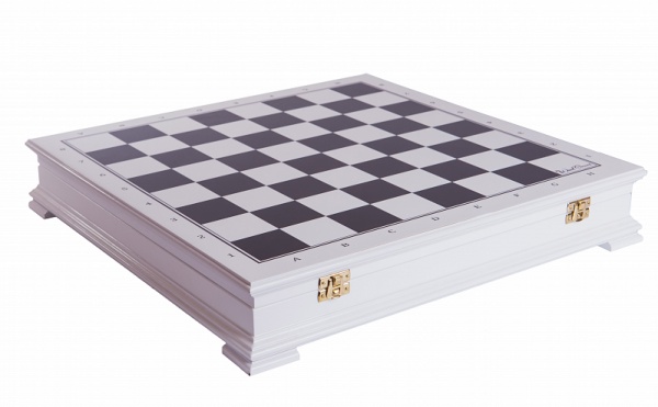 Интересной деталью является то, что доска имеет форму коробки. То есть, она не складывается напополам, а состоит из верхней крышки, на которой нанесено поле, и дна. Такая особенность делает ее более долговечной, тем более что держится она на прочных нержавеющих петлях. Внутри коробка имеет форму лотка с ячейками под каждую отдельную фигуру.