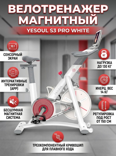 Велотренажер DFC Yesoul S3 PRO WHITE - ОписаниеВелотренажер Yesoul S3 PRO WHITE – это спинбайк премиального уровня с эксклюзивным 10,1-дюймовым сенсорным экраном высокого разрешения. На тренажере установлено фирменное приложение Yesoul, нет необходимости в iPad и мобильных устройствах для подключения. На экран выводится вся информация про вашу тренировку, а большой размер экрана позволит еще глубже погрузиться в тренировку.