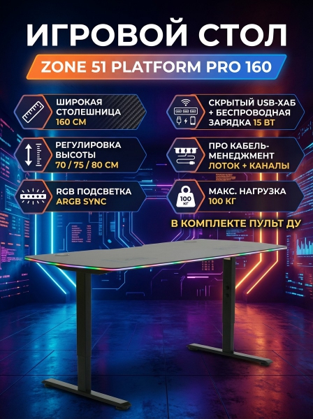 Стол компьютерный игровой Zone 51 Platform PRO 160 - ОписаниеСомневаетесь? - Посмотрите рейтинг ТОП-10 по категории «Геймерские столы»Стол компьютерный игровой Platform PRO 160 с широкой столешницей с отделкой "под карбон", регулировкой высоты и RGB подсветкой по всему контуру стола.
