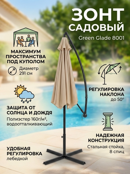 Зонт садовый Green Glade 8001 - ОписаниеЗонт садовый Green Glade 8001 – подойдет для отдыха на даче, загородном участке и около бассейна. Он защитит вас и ваших детей от яркого солнца и создаст комфортную тень. Купол зонта легко открывается с помощью лебедки. Благодаря боковому расположению стойки под куполом можно установить любую пластиковую мебель: от шезлонга до обеденного стола. В комплекте с зонтом идет основание – крестовина, на которую для устойчивости можно установить бетонные утяжелители (в комплект не входят) или привернуть ее через имеющиеся отверстия к полу.